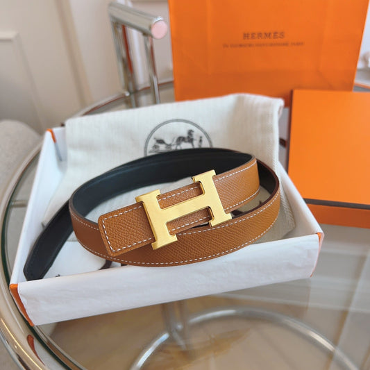 Mini H 2.4cm Brown Grained Leather Belt Gold Buckle