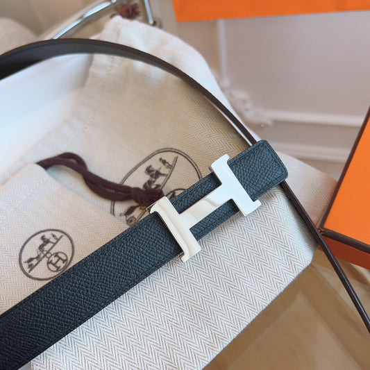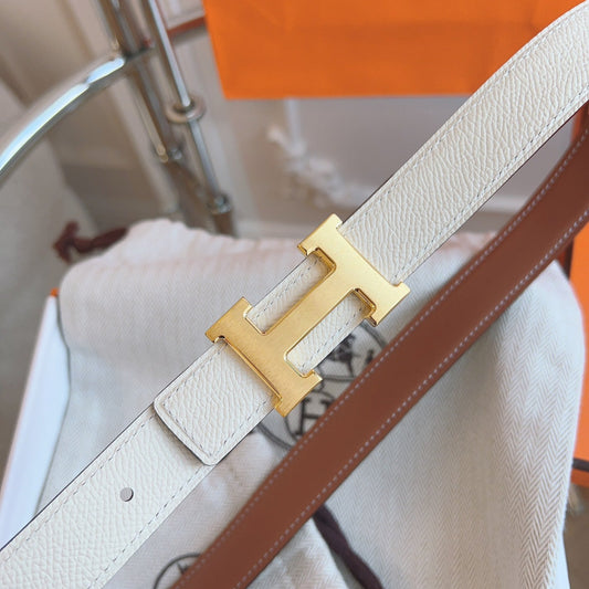 Mini H 2.4cm White Grained Leather Belt Gold Buckle