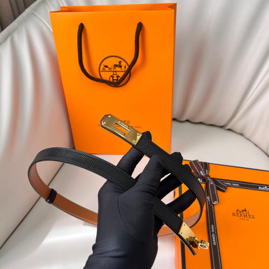 Kelly 1.8cm Black Grained Leather Belt Gold Buckle