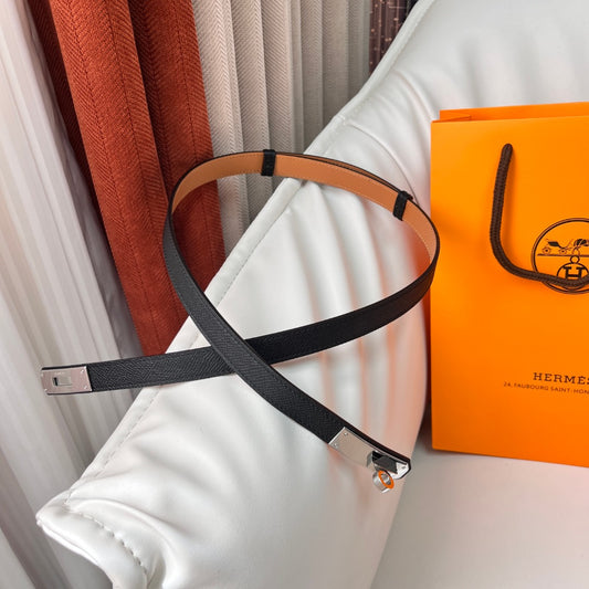 Mini H 2.4cm Black Grained Leather Belt Silver Buckle