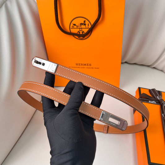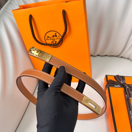 Kelly 1.8cm Brown Grained Leather Belt Gold Buckle