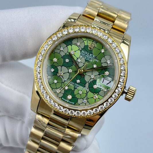 Crystal Bezel Floral Ladies Watch Green & Gold 31mm RLX - Level 3
